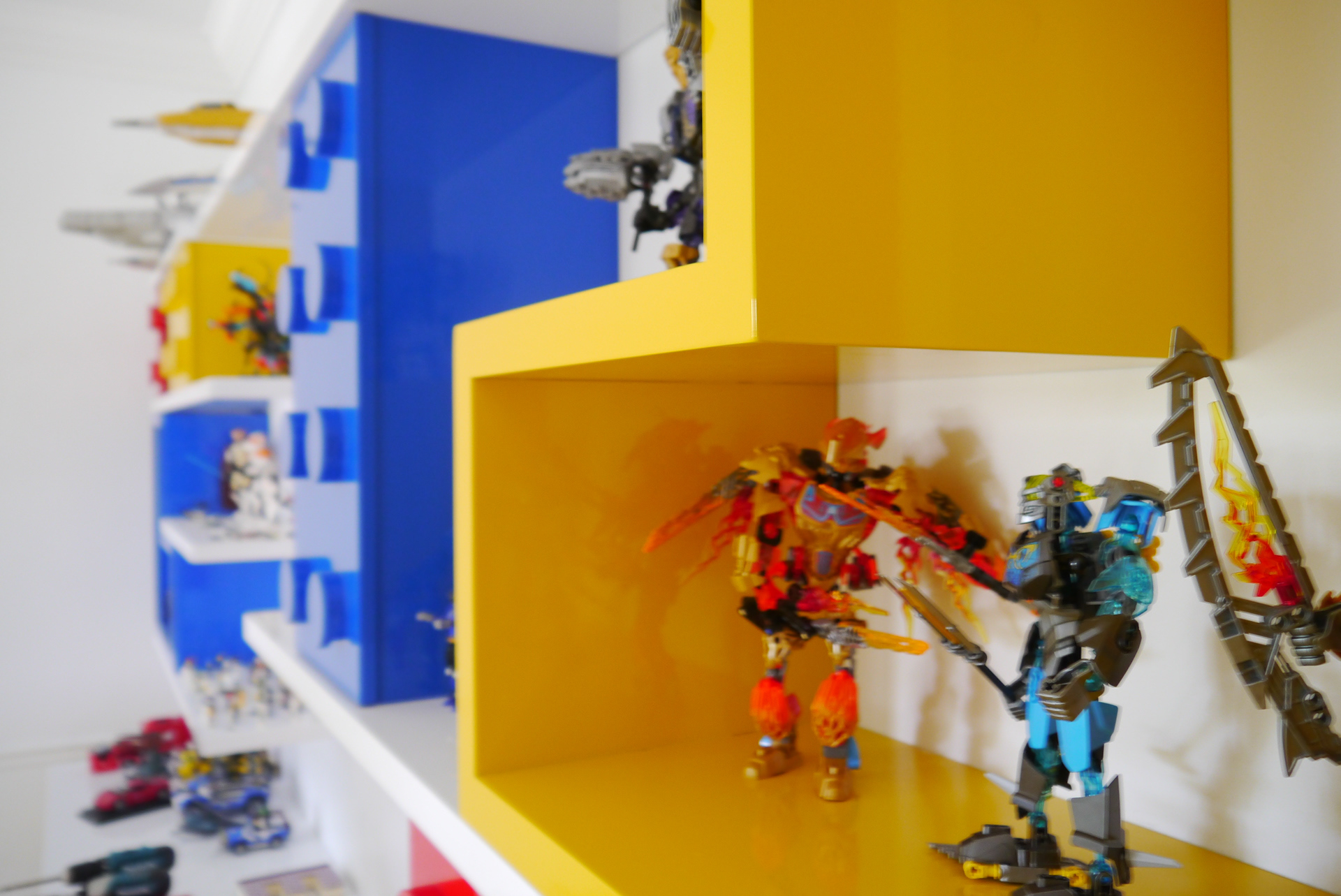 Una comisión especial para una familia con una colección impresionante de LEGO. Las gavetas fueron modeladas proporcionalmente según las piezas y colores reales de LEGO y acomodadas para sostener el escritorio. Sobre el mismo, unas tablillas largas y cajones abiertos funcionan como escaparates para mostrar algunas figuras, carros y naves de la colección.
