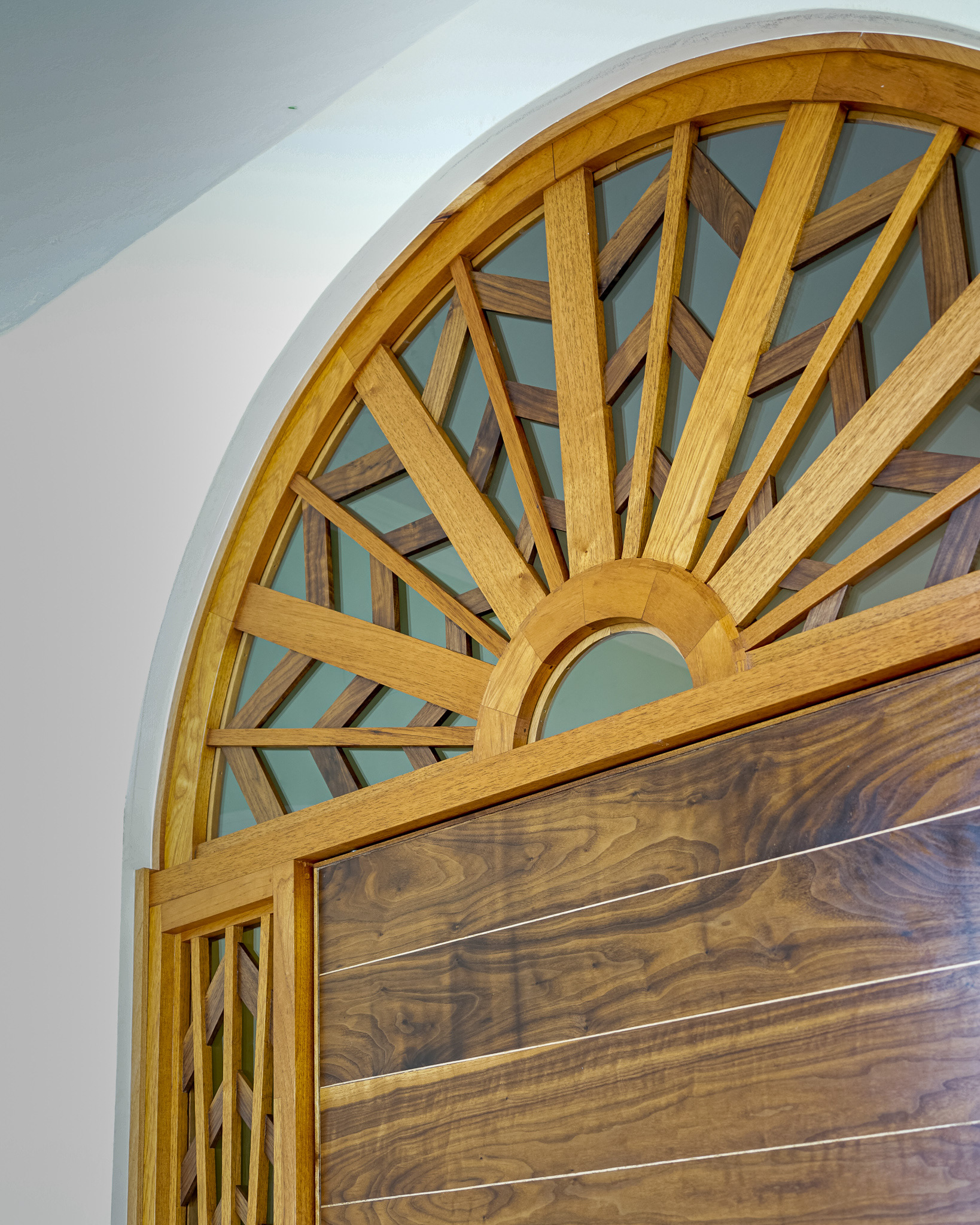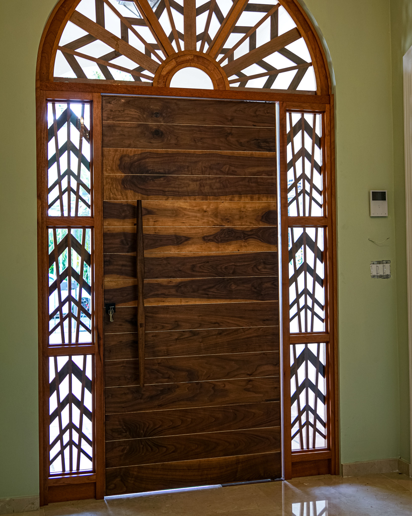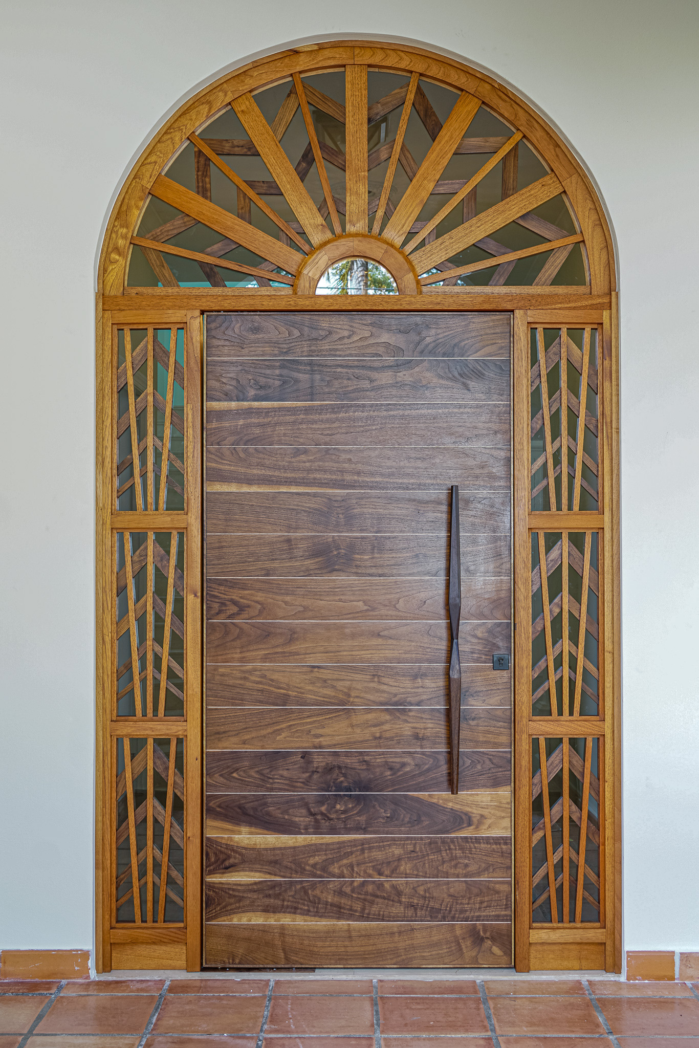 Una puerta especialmente comisionada para rejuvenecer la entrada a una residencia. Se escogió una tipología de puerta que incluyera un sol trunco.