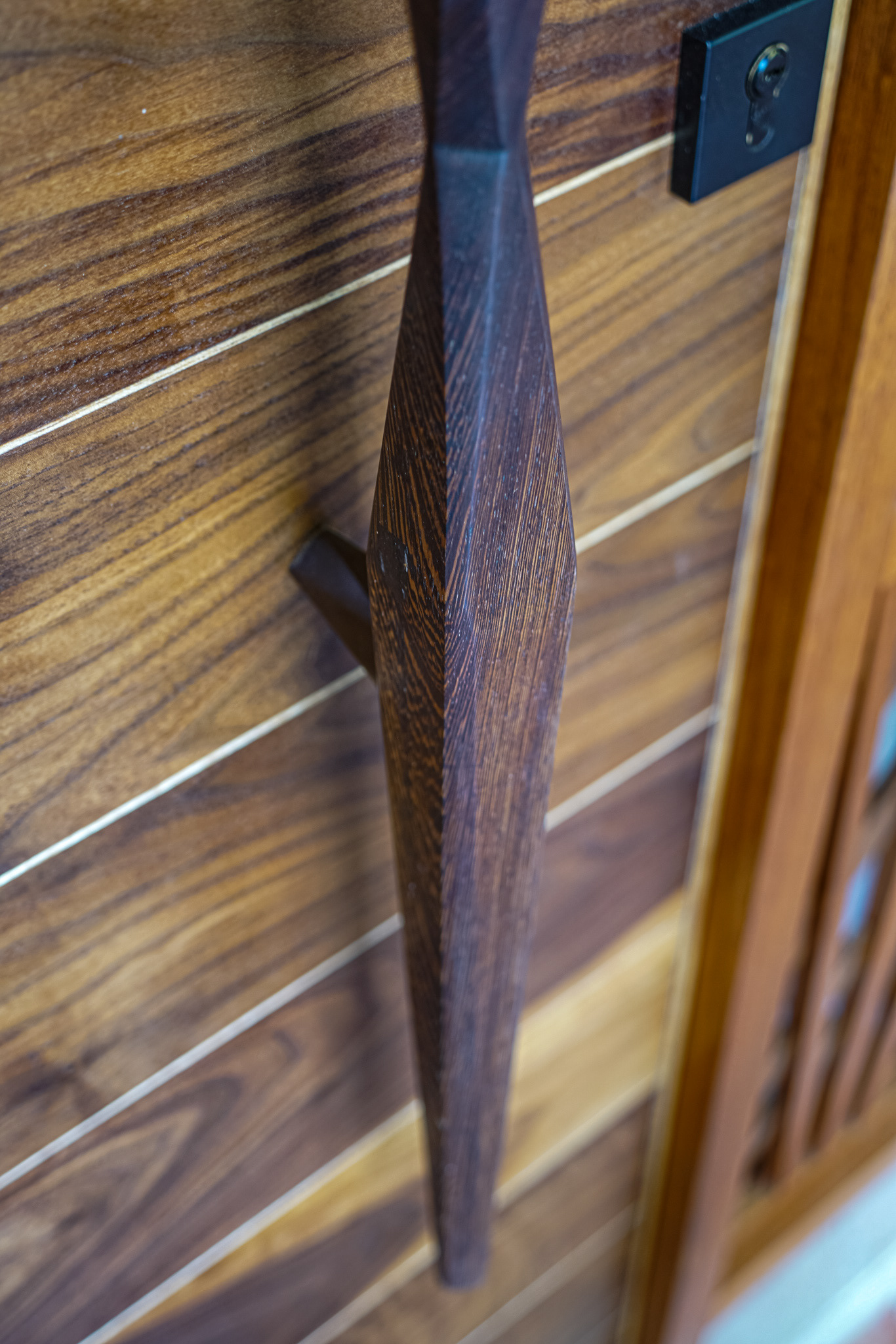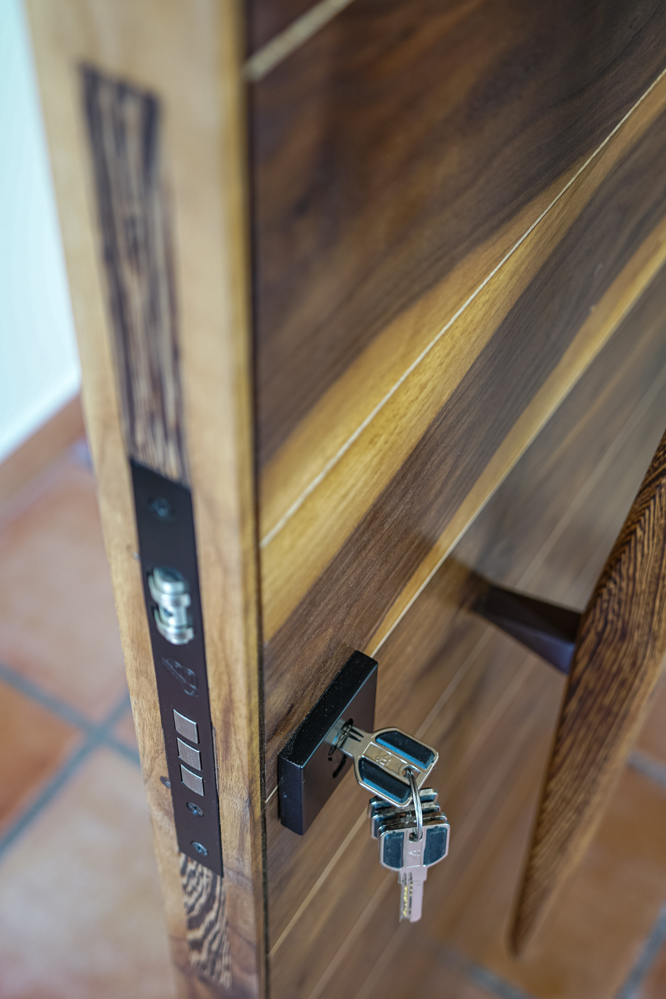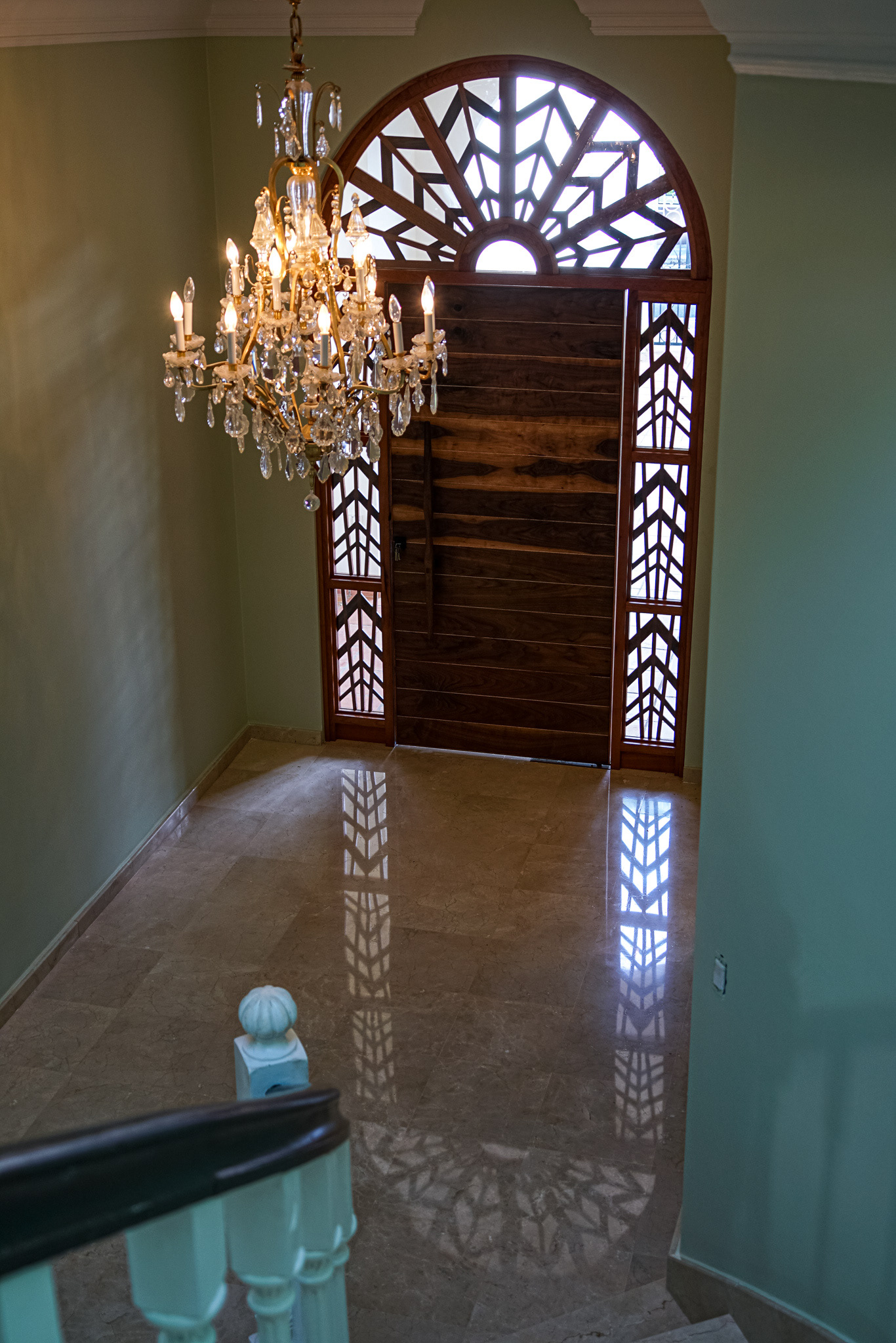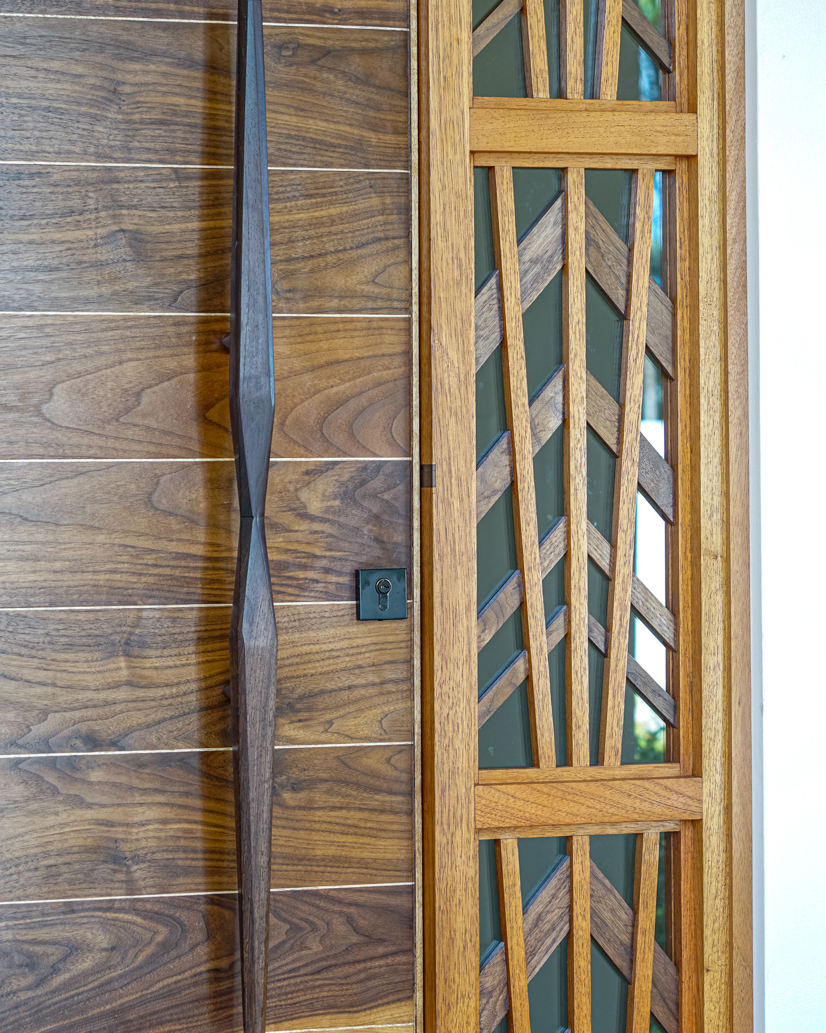 Una puerta especialmente comisionada para rejuvenecer la entrada a una residencia. Se escogió una tipología de puerta que incluyera un sol trunco.